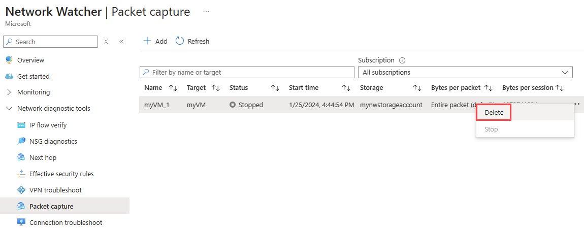V části Nástroje pro diagnostiku sítě vyberte Zachytávání paketů a pak výběrem + Přidat vytvořte zachytávání paketů.