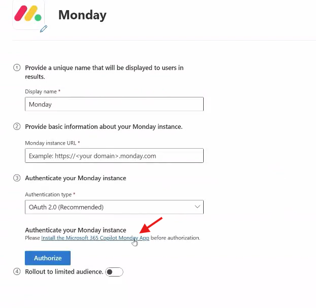 With OAuth authentication, you install and authorize the Microsoft 365 Copilot Monday app in your Monday.com workspace. During authorization, you sign in to Monday.com and grant read permissions required for content ingestion.