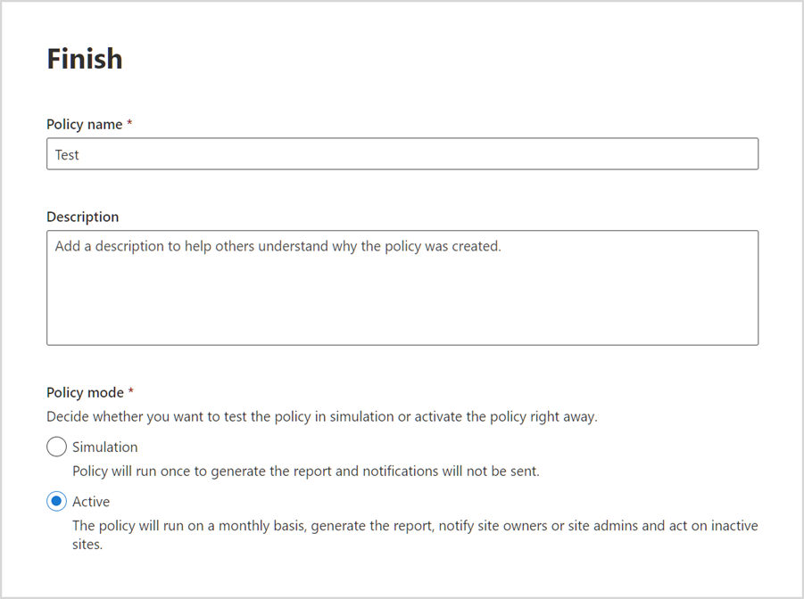 On the Finish step, specify a name and description for your policy, and select a policy mode. Then Select Finish.