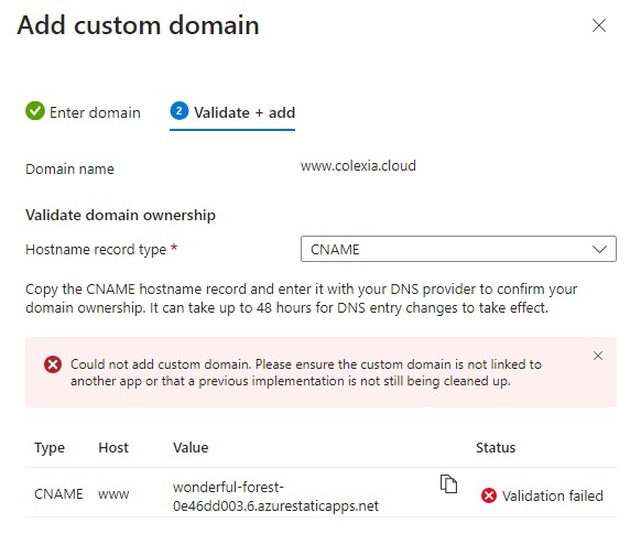I have correctly set the CNAME record as instructed (www → wonderful-forest-0e46dd003.6.azurestaticapps.net), but the validation keeps failing and I’m unable to add the domain.