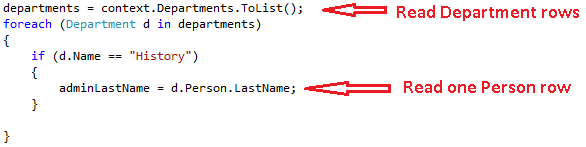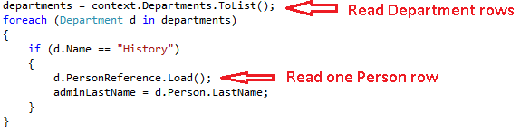 Loadmetody navigační vlastnosti pro kolekce nebo pomocíLoadmetody referenční vlastnosti pro vlastnosti, které obsahují jeden objekt. (Voláním metody můžete napříkladPersonReference.LoadnačístPersonnavigační vlastnostDepartmententity.)