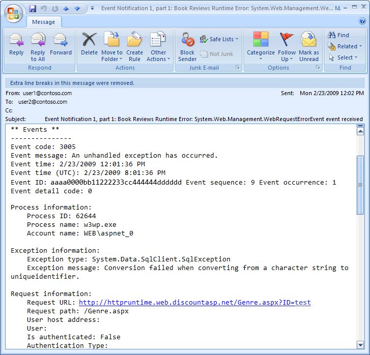 Obrázek 2 ukazuje e-mail vygenerovaný SimpleMailWebEventProvider třídou při návštěvě Genre.aspx?ID=foo.