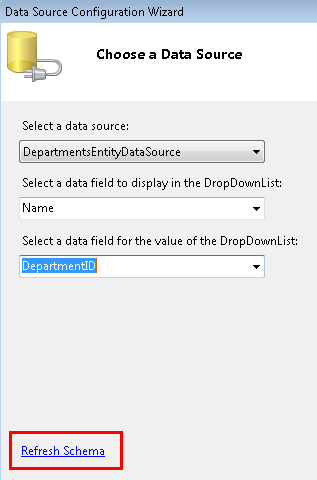 V kroku Zvolte zdroj dat vyberte Jako zdroj dat možnost DepartmentsEntityDataSource , klikněte na Aktualizovat schéma a pak vyberte Název jako datové pole, které chcete zobrazit, a Id oddělení jako datové pole hodnoty. Klikněte na OK.
