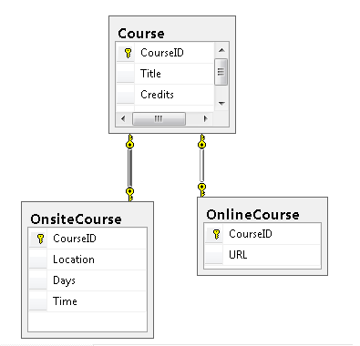 Datový model Entity Framework můžete nakonfigurovat tak, aby OnlineCourse entity a OnsiteCourse dědily Course z entity. Tento model generování struktury dědičnosti entit ze samostatných tabulek pro každý typ, přičemž každá samostatná tabulka odkazuje zpět na tabulku, která ukládá data společná pro všechny typy, se nazývá dědičnost typu (TPT ).