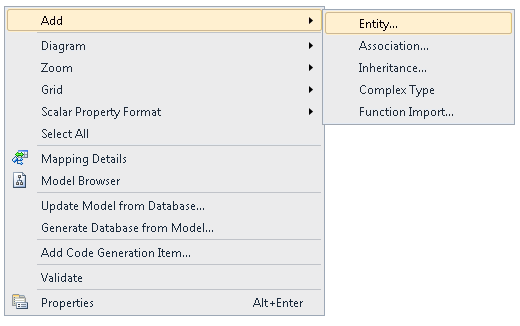 Otevřete soubor SchoolModel.edmx , klikněte pravým tlačítkem na neobsazenou oblast v návrháři, vyberte Přidat a pak vyberte Entita.