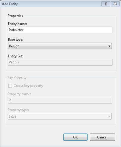 Klikněte na OK. Návrhář vytvoří entitu Instructor , která je odvozena z Person entity. Nová entita ještě nemá žádné vlastnosti.