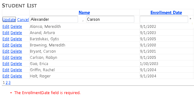 EnrollmentDatezobrazí se jako datum (bez času).- Obě pole názvů musí mít délku 25 znaků nebo méně a je zadána vlastní chybová zpráva.