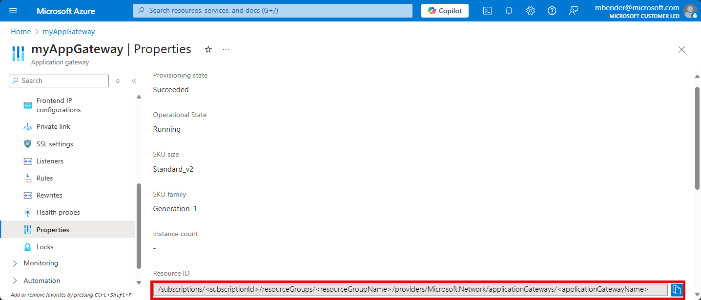 Poznamenejte si ID prostředku vaší aplikační brány, pro kterou je protokolování povoleno. Tato hodnota je ve formuláři: /subscriptions/<subscriptionId>/resourceGroups/<resourceGroupName>/providers/Microsoft.Network/applicationGateways/<applicationGatewayName>. Tuto informaci najdete pomocí webu Azure Portal.