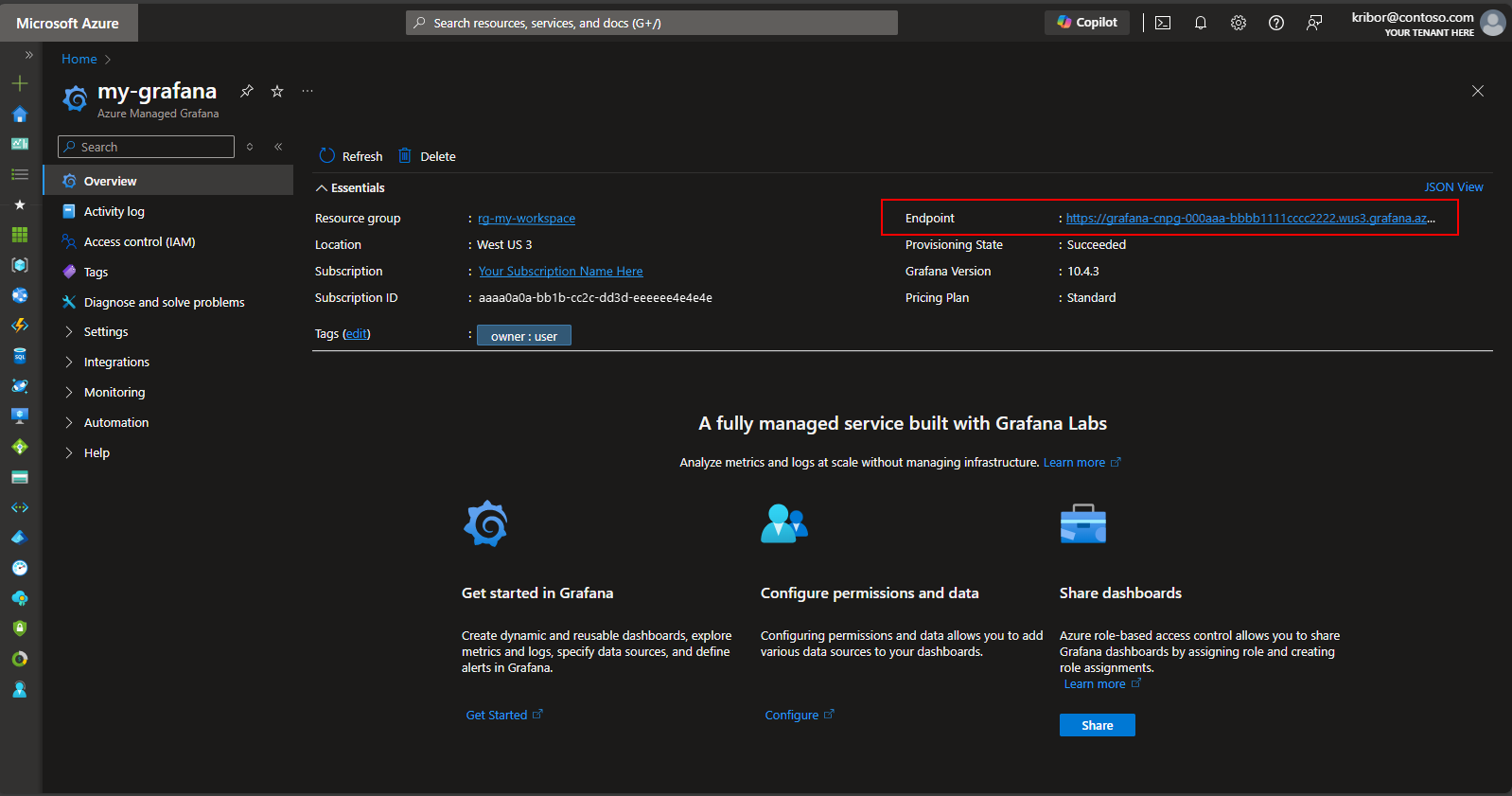 Případně můžete po nasazení clusteru Postgres a monitorování podů vytvořit řídicí panel metrik na spravované instanci Grafana vytvořené skriptem nasazení a vizualizovat metriky exportované do pracovního prostoru služby Azure Monitor. Ke spravované grafaně se dostanete přes Azure Portal. Přejděte na spravovanou instanci Grafana vytvořenou skriptem nasazení a vyberte odkaz na koncový bod, jak je znázorněno tady:
