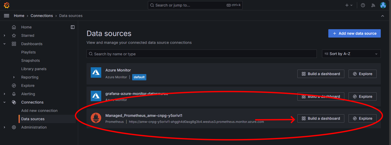 Výběrem odkazu Koncový bod otevřete nové okno prohlížeče, ve kterém můžete vytvářet řídicí panely ve spravované instanci Grafana. Podle pokynů ke konfiguraci zdroje dat azure Monitoru pak můžete přidat vizualizace pro vytvoření řídicího panelu metrik z clusteru Postgres. Po nastavení připojení ke zdroji dat v hlavní nabídce vyberte možnost Zdroje dat. Měli byste vidět sadu možností zdroje dat pro připojení ke zdroji dat, jak je znázorněno tady: