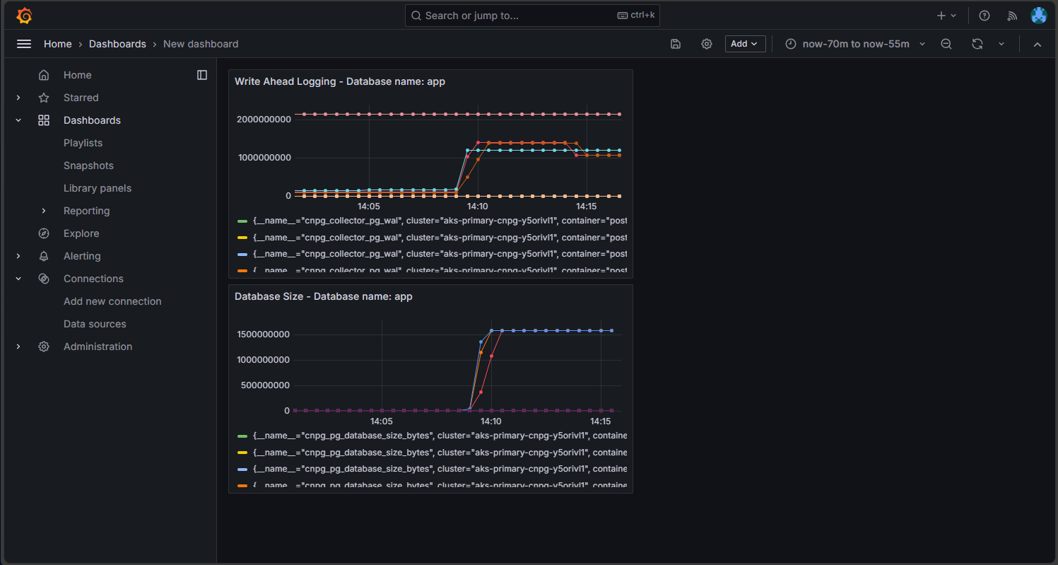 cat <<EOF | kubectl apply --context $AKS_PRIMARY_CLUSTER_NAME --namespace $PG_NAMESPACE -f - apiVersion: monitoring.coreos.com/v1 kind: PodMonitor metadata: name: $PG_PRIMARY_CLUSTER_NAME namespace: ${PG_NAMESPACE} labels: cnpg.io/cluster: ${PG_PRIMARY_CLUSTER_NAME} spec: selector: matchLabels: cnpg.io/cluster: ${PG_PRIMARY_CLUSTER_NAME} podMetricsEndpoints: - port: metrics EOF