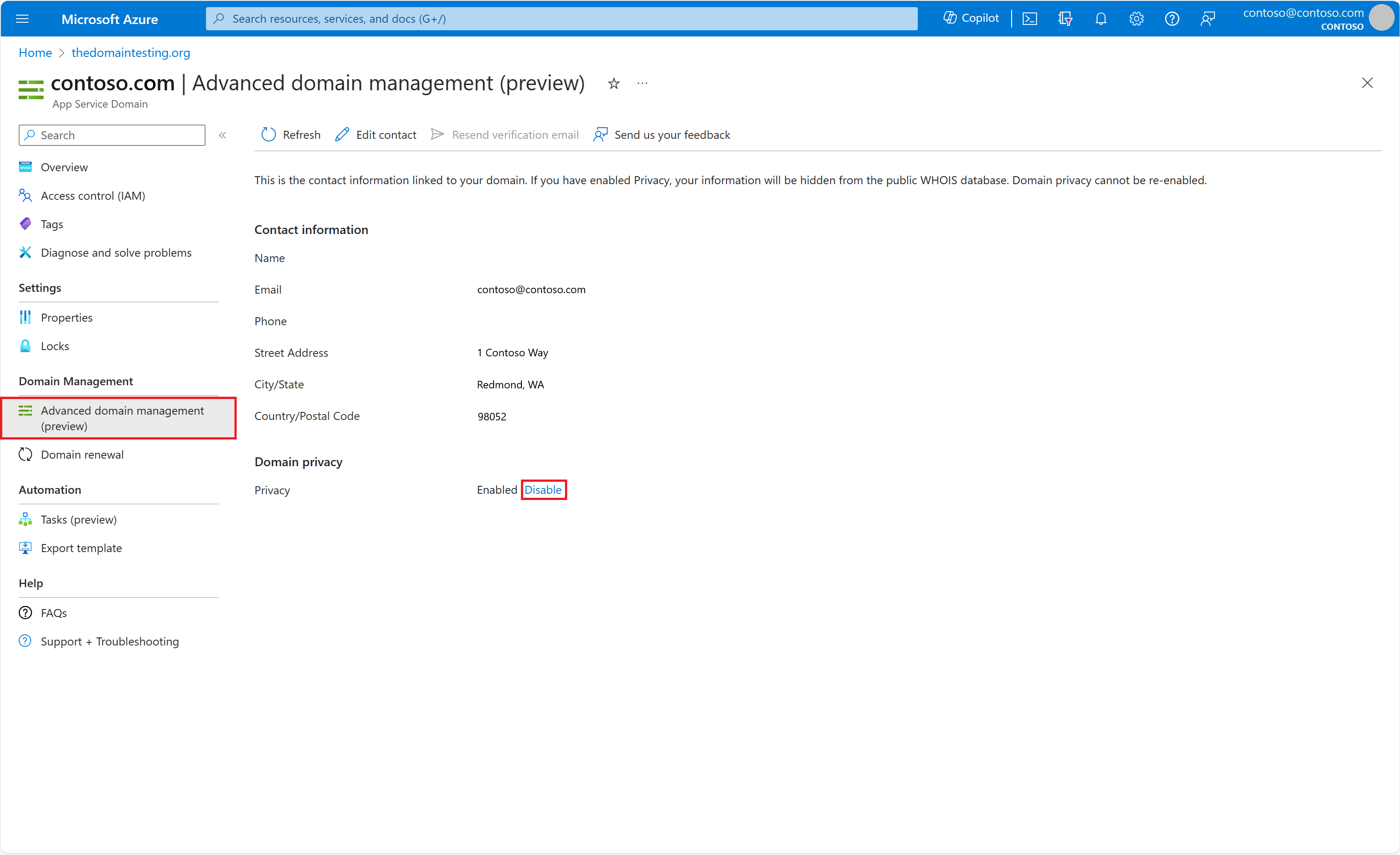 V levém navigačním panelu domény vyberte Rozšířená správa domén (Preview). Chcete-li aktualizovat kontaktní údaje, vyberte Upravit kontakt.