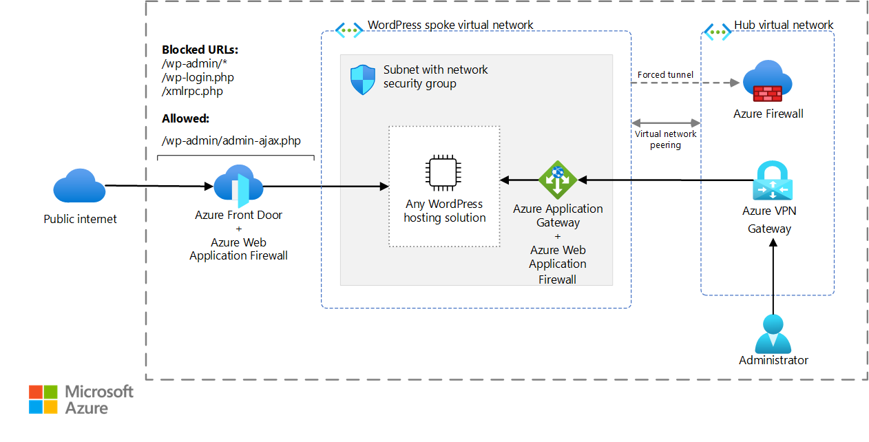 Můžete například zablokovat přístup k privátním adresám URL ve službě Azure Front Door. Bránu Aplikace Azure lication pak můžete použít k poskytování interního přístupu z privátní sítě, která používá hvězdicovou topologii. Interní instance služby Application Gateway podporují pravidla firewallu webových aplikací a pravidla služby Azure Front Door. Tato pravidla pomáhají chránit instalaci WordPressu před interními útoky. Pokud můžete tolerovat riziko interního útoku, můžete místo služby Application Gateway použít interní instanci Azure Load Balanceru. Load Balancer funguje ve vrstvě čtyři modelu Open Systems Interconnection (OSI).