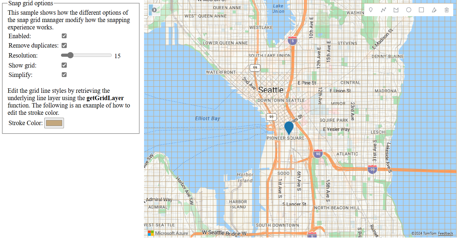 Ukázka přichycení mřížky přichytí značku HTML k mřížce při přetažení. Nástroje kreslení slouží k přichycení nakreslených obrazců k mřížce při drawingcomplete spuštění události. Zdrojový kód pro tuto ukázku najdete v tématu Použití přichycení zdrojového kódu mřížky.