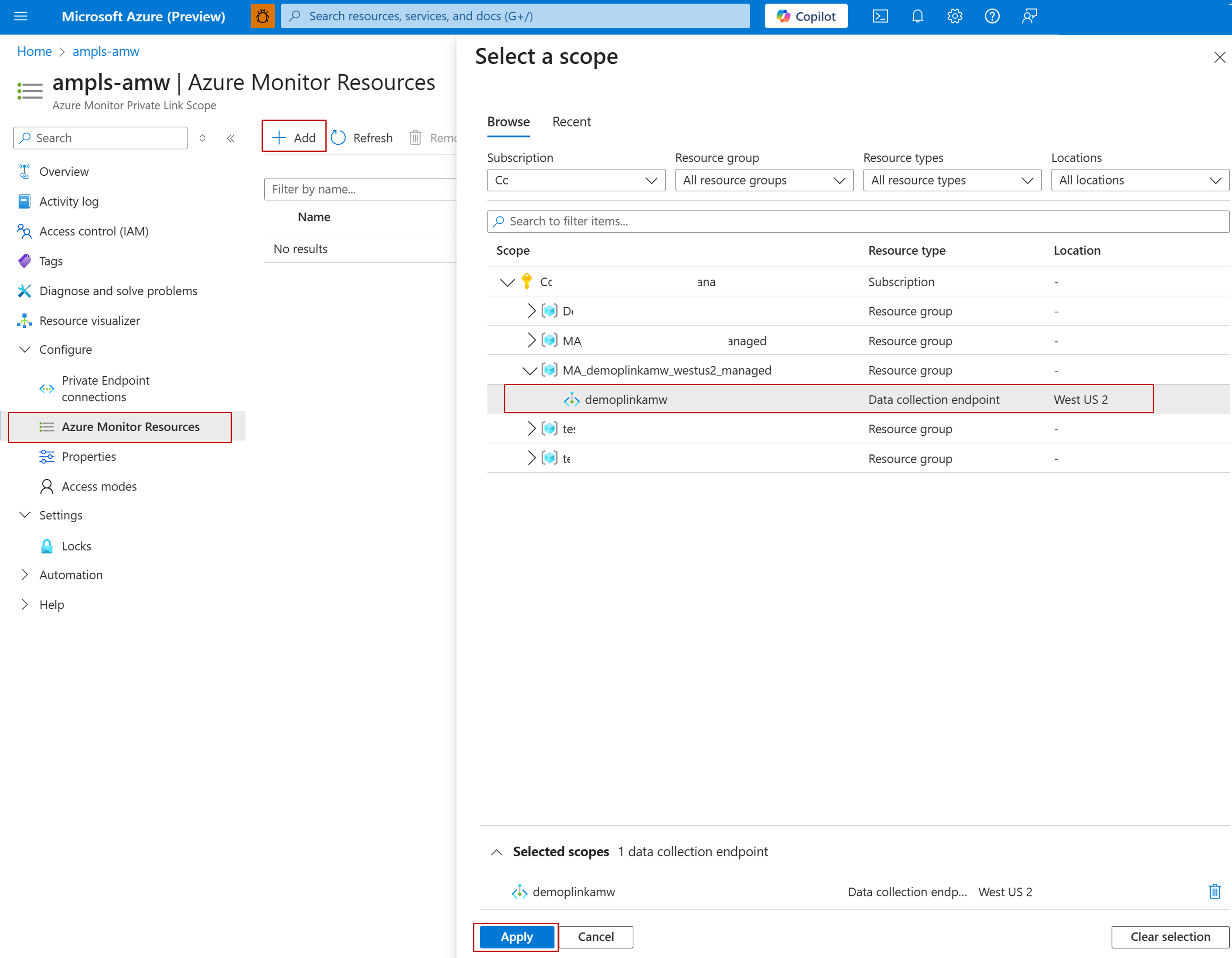 Přejděte na stránku přehledu služby AMPLS, klikněte na prostředky služby Azure Monitor, klikněte na Přidat a pak připojte vytvořenou databázi DCE.