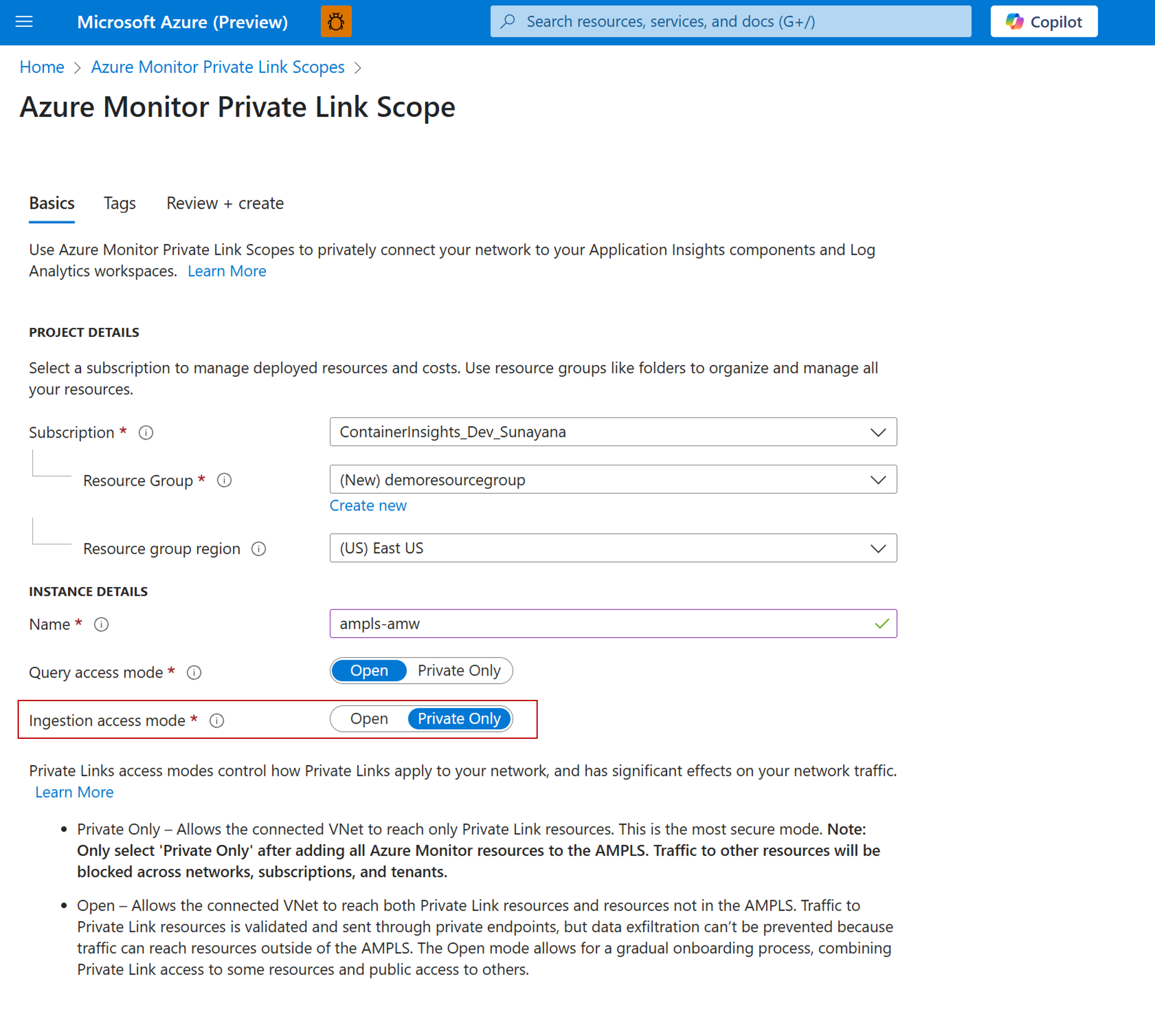 Další informace o nastavení služby AMPLS najdete v tématu Konfigurace privátního propojení pro Azure Monitor.