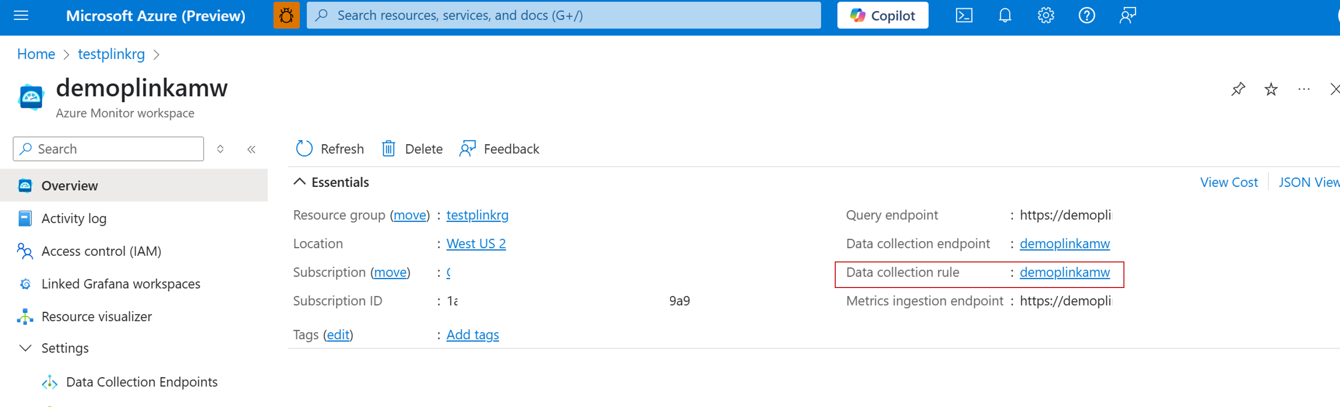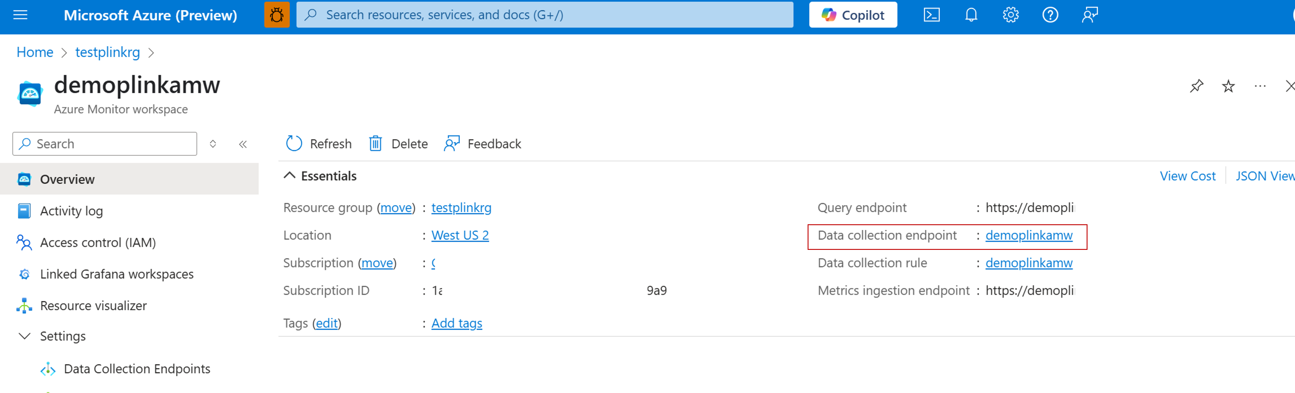 Na portálu Azure vyhledejte pracovní prostor služby Azure Monitor, který jste vytvořili jako součást povolení spravovaného Prometheus pro váš privátní cluster AKS. Poznamenejte si název koncového bodu shromažďování dat.