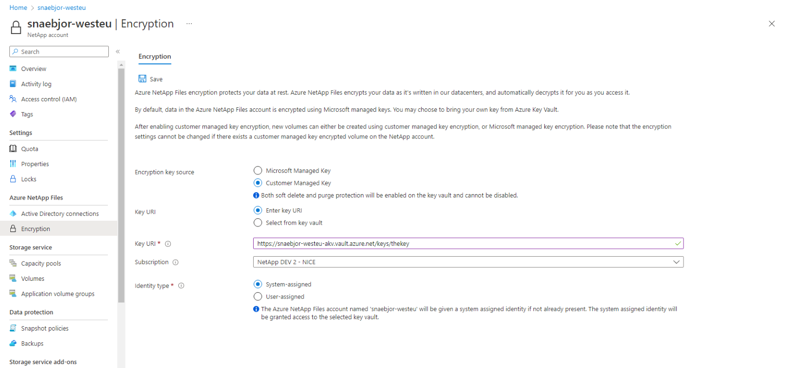 - Ujistěte se, že jste nakonfigurovali účet Azure NetApp Files tak, aby používal klíče spravované zákazníkem.