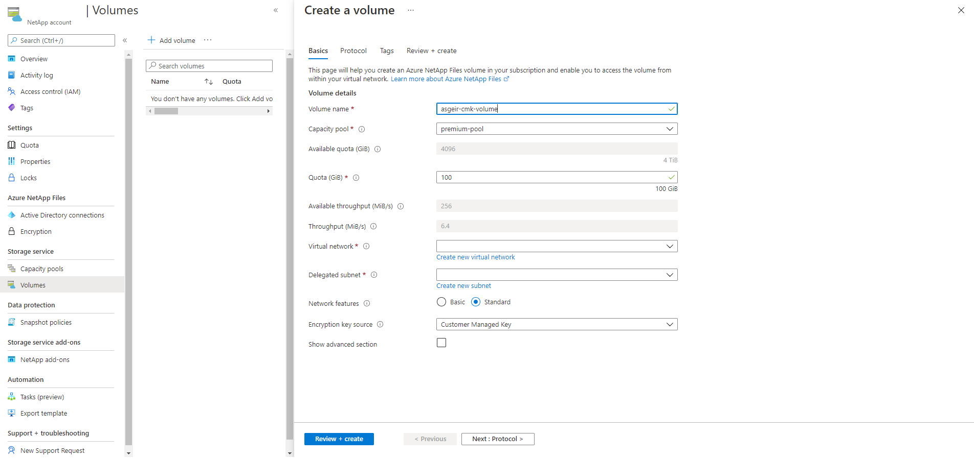 Když vytváříte svazek pomocí klíče spravovaného zákazníkem, musíte také pro možnost Síťové funkce vybrat Standard. Základní síťové funkce nejsou podporovány.