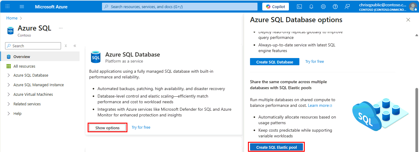 V okně možností služby Azure SQL Database vyberte Vytvořit elastický fond SQL.