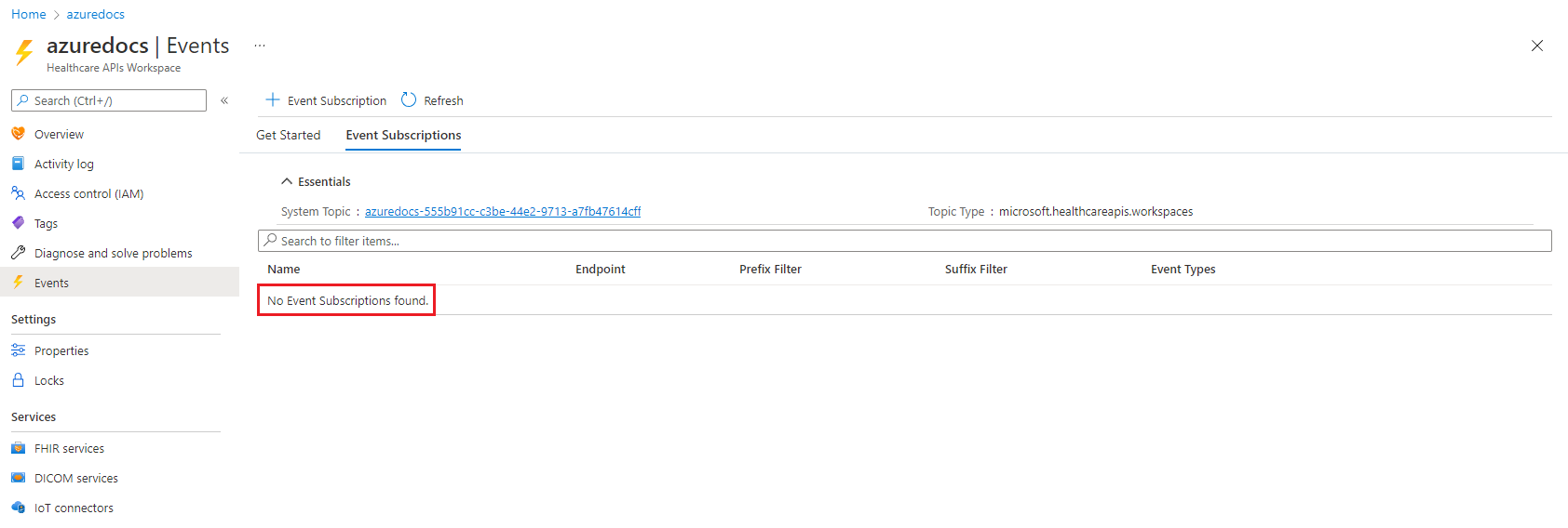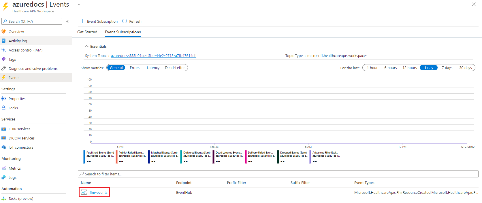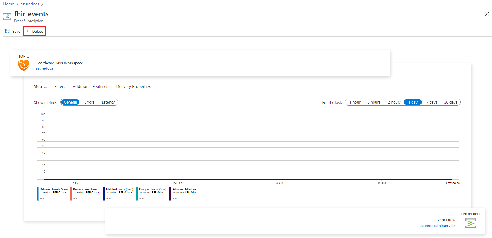 Vyberte odběr události , který chcete odstranit. V tomto příkladu vybereme odběr události s názvem fhir-events.
