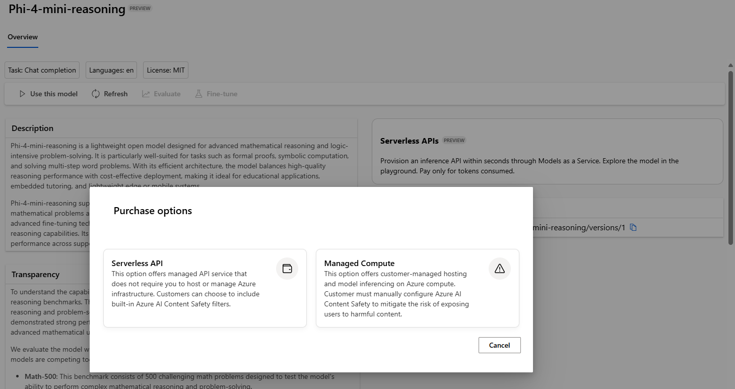 Model můžete nasadit výběrem tlačítka Použít tento model na kartě modelu pro jakýkoli základní model a výběrem bezserverového rozhraní API nebo spravovaného výpočetního prostředí. Ne všechny modely podporují nasazení bezserverového rozhraní API. Pokud model nepodporuje bezserverové rozhraní API, zobrazí se pouze možnost Spravované výpočetní prostředky .