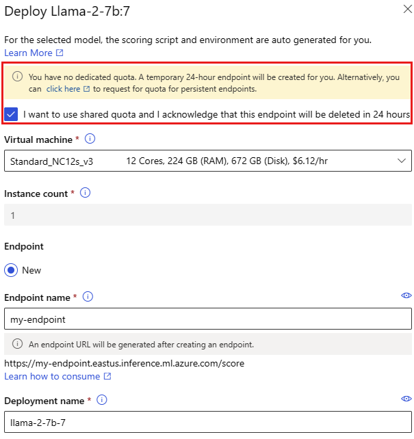 Pokud nasazujete model z katalogu modelů, ale nemáte k dispozici dostatečnou kvótu pro nasazení, azure Machine Learning umožňuje používat kvótu ze sdíleného fondu kvót po omezenou dobu. Další informace o sdílené kvótě najdete v tématu Sdílená kvóta služby Azure Machine Learning.