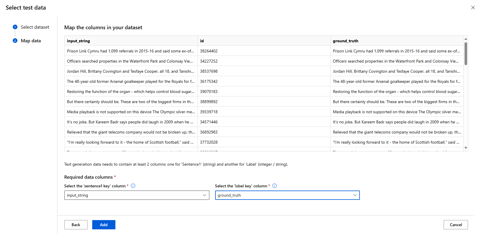 Jakmile vyberete datovou sadu, musíte namapovat sloupce ze vstupních dat na základě schématu potřebného pro úkol. Příklad: mapování názvů sloupců, které odpovídají klíčům "věta" a "label" pro klasifikaci textu