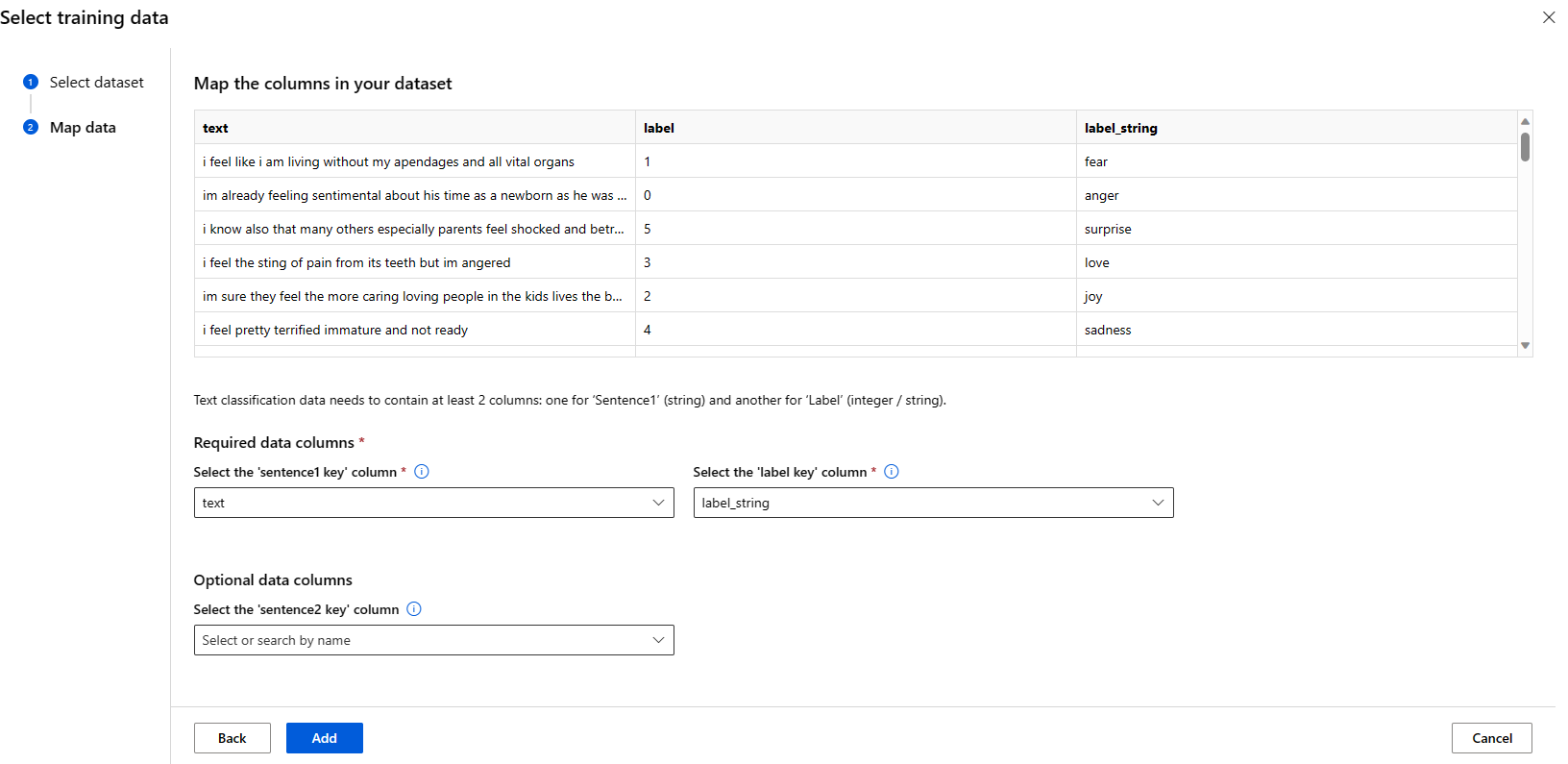 - Po výběru datové sady je potřeba namapovat sloupce ze vstupních dat na základě schématu potřebného pro úkol. Například namapujte názvy sloupců, které odpovídají klíčům "věta" a "label" pro klasifikaci textu.