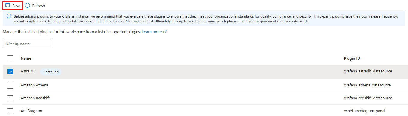 Před přidáním modulů plug-in do vaší instance Grafana doporučujeme tyto moduly plug-in vyhodnotit, abyste zajistili, že splňují standardy vaší organizace pro kvalitu, dodržování předpisů a zabezpečení. Moduly plug-in třetích stran mají vlastní frekvenci vydávání verzí, bezpečnostní důsledky, procesy testování a aktualizace, které jsou mimo kontrolu Microsoftu. Nakonec je na vás určit, které moduly plug-in splňují vaše požadavky a potřeby zabezpečení.
