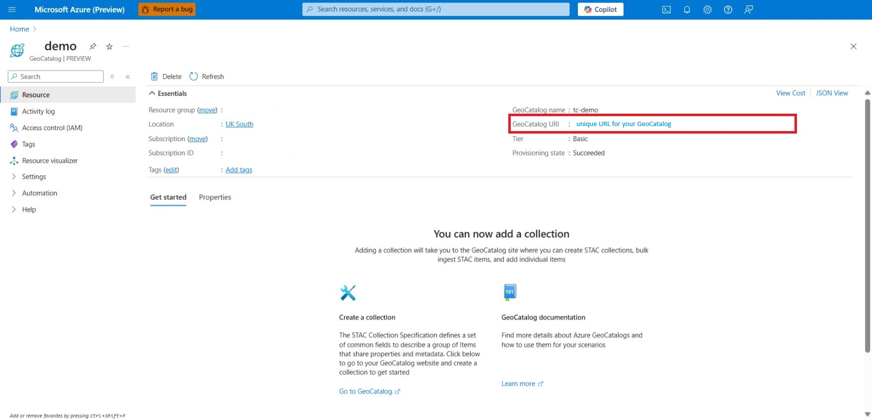 Webové rozhraní Microsoft Planety Computer Pro je webová platforma, kterou používáte ke správě geoprostorových dat. Přístup k webovému rozhraní pomocí identifikátoru URI zadaného v prostředku GeoCatalog na webu Azure Portal: