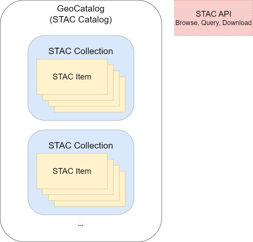 GeoCatalog ukládá a organizuje geoprostorové datové sady do kolekcí. Položka STAC je základním objektem v kolekci GeoCatalogu. Obsahuje metadata scény a odkazy na objekty z této scény, například satelitní obrázek. Metadata položky umožňuje GeoCatalogu vyhledávat a dotazovat prostorové zdroje. Další informace o položkách STAC naleznete v tématu STAC Item Spec.