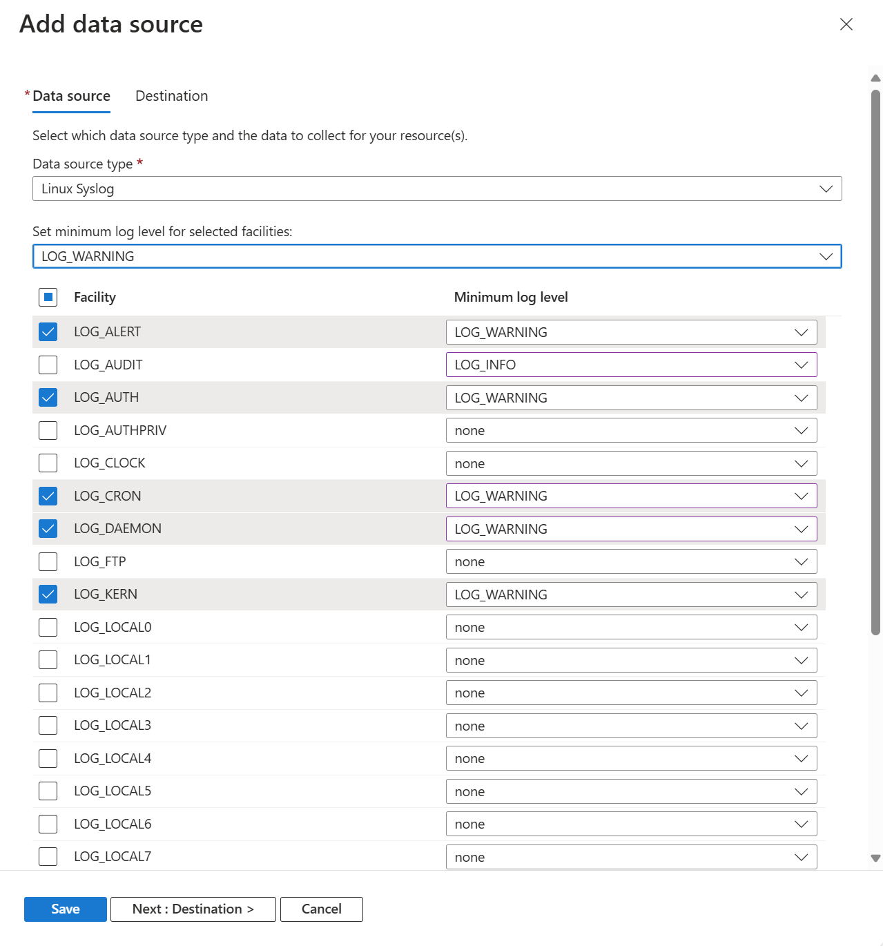 Úplný postup konfigurace shromažďování dat Syslog najdete v tématu Shromažďování událostí Syslogu pomocí agenta služby Azure Monitor.