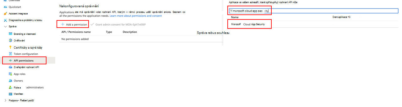 Pokud chcete aplikaci povolit přístup k Defender for Cloud Apps a přiřadit jí oprávnění Číst všechna upozornění, vyberte na stránce vaší aplikace možnost Oprávnění> rozhraní API Přidat rozhraní APIoprávnění>, kterápoužívá> moje organizace, zadejte Microsoft Cloud App Security a pak vyberte Microsoft Cloud App Security.