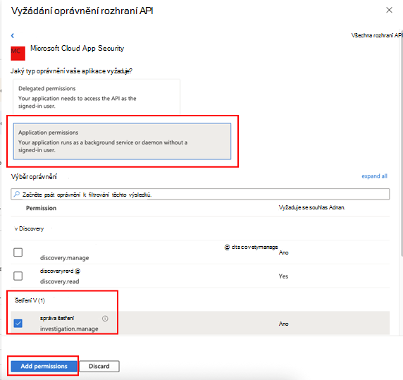 Musíte vybrat příslušná oprávnění. Investigation.Read je jenom příklad. Další obory oprávnění najdete v tématu Podporované obory oprávnění.