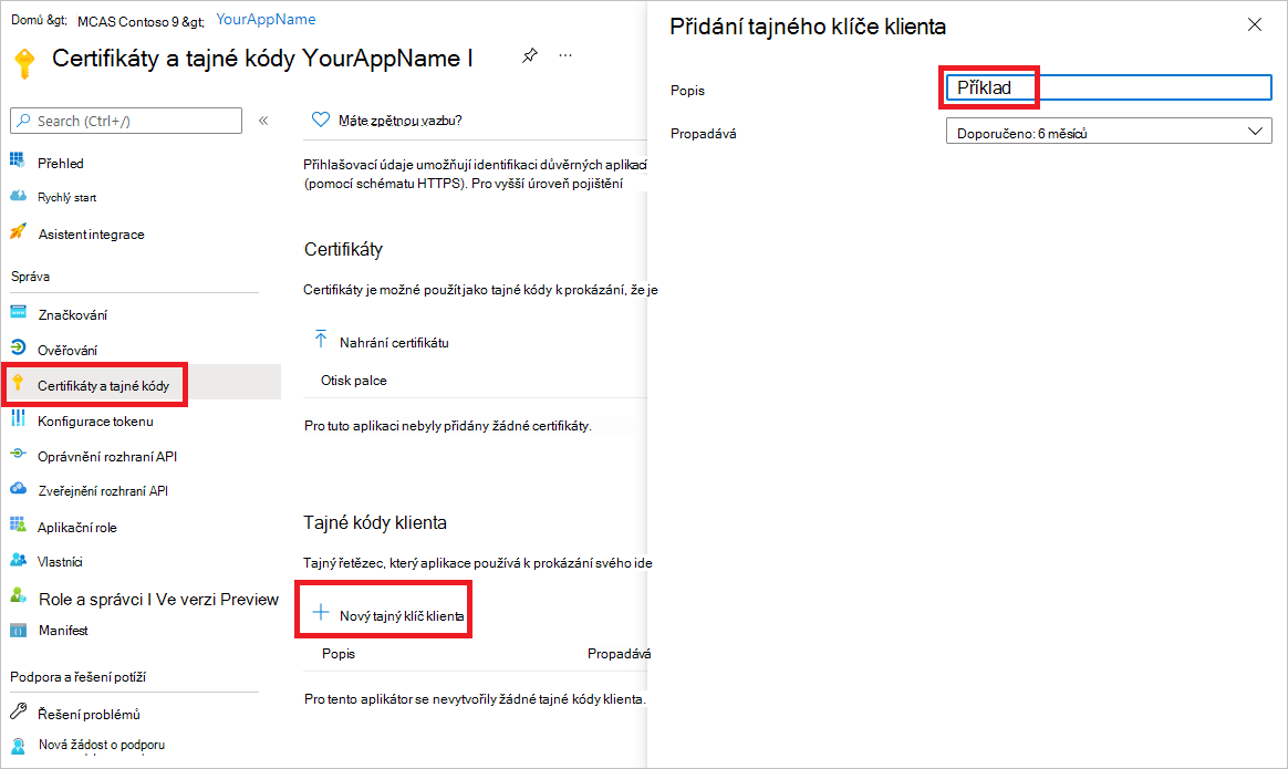 Pokud chcete do aplikace přidat tajný klíč, vyberte Certifikáty & tajné kódy a vyberte Nový tajný klíč klienta. Přidejte popis tajného kódu a pak vyberte Přidat.