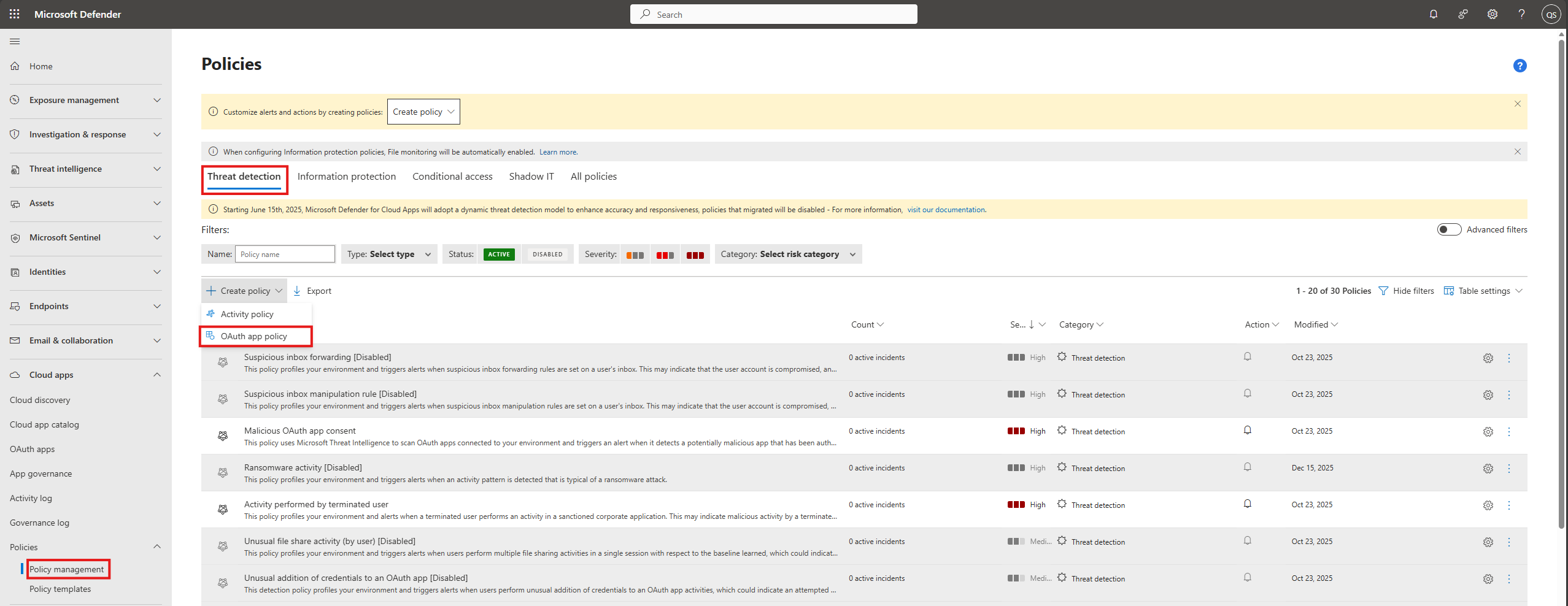 Vyberte kartu Detekce hrozeb a pak vyberte Vytvořit zásadu následovanou zásadou aplikace OAuth.