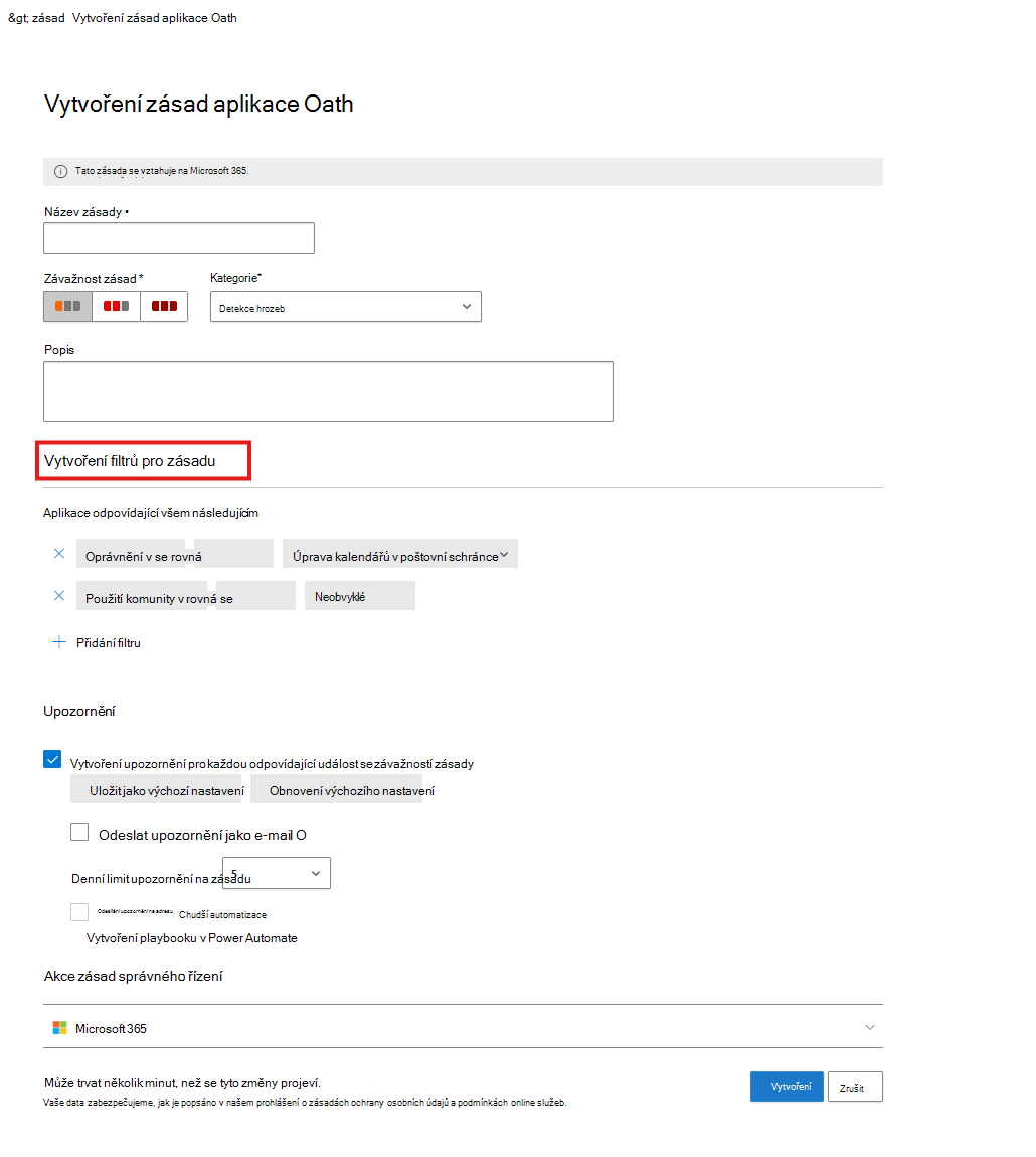 - Závažnost zásad detekce anomálií aplikací OAuth se nedá změnit.