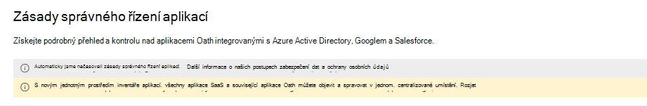 Karta Aplikace OAuth poskytuje přehled o Microsoftu 365, pracovním prostoru Google a Salesforce. Správci můžou aplikace zkontrolovat a rozhodnout se, že je zakáže nebo použije zásady pro monitorování jejich chování ve svém prostředí.