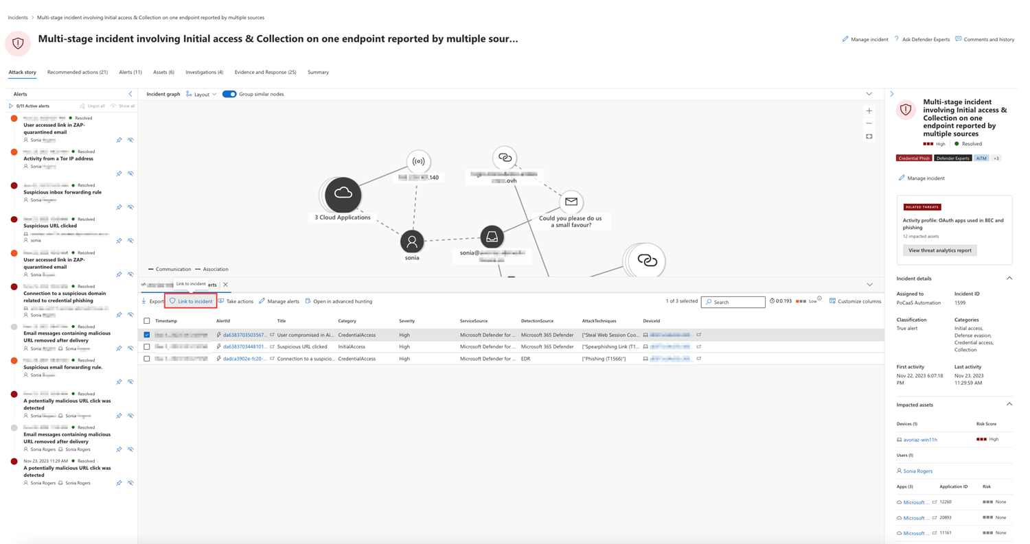 Výsledné protokoly nebo výstrahy je možné propojit s incidentem tak, že vyberete výsledek a pak vyberete Propojit s incidentem.