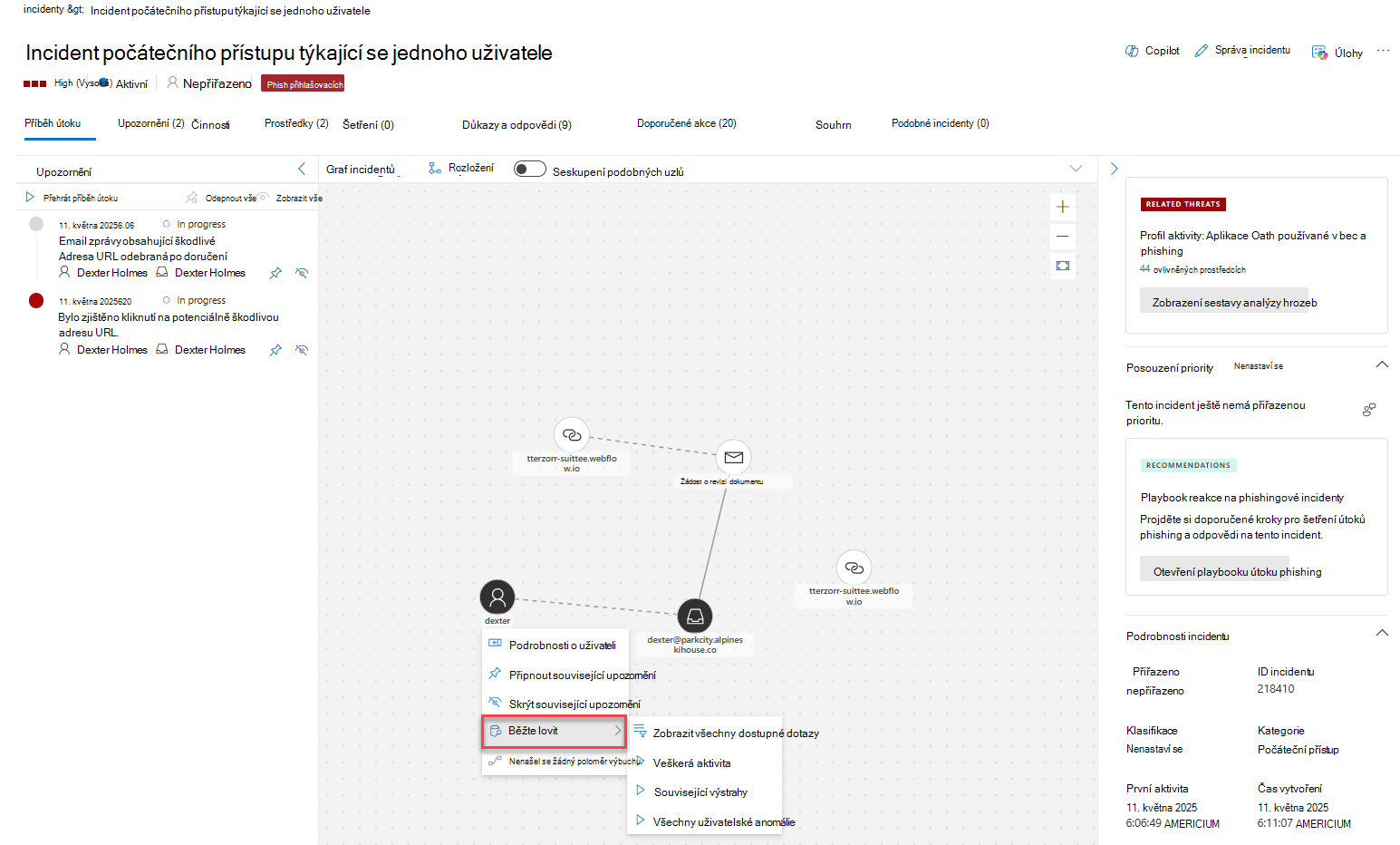 | Informace o incidentu | Zobrazí vlastnosti incidentu, jako jsou značky, stav a závažnost. |