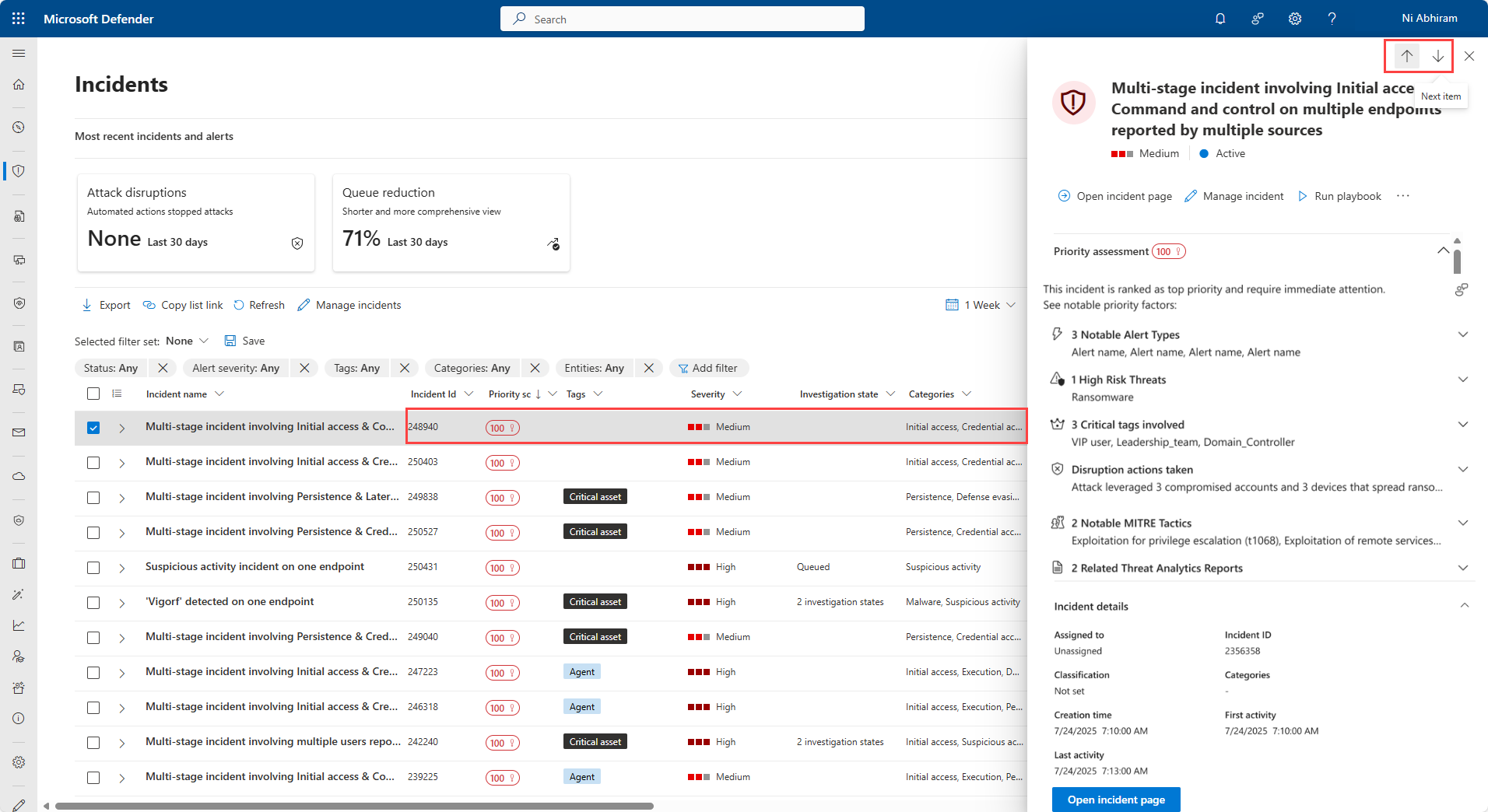 Můžete začít tak, že vyberete řádek incidentu, ale nevyberete název incidentu. Otevře se podokno souhrnu s klíčovými informacemi o incidentu, včetně posouzení priority, faktorů ovlivňujících skóre priority, podrobností incidentu, doporučených akcí a souvisejících hrozeb. Pomocí šipek nahoru a dolů v horní části podokna přejděte na předchozí nebo další incident ve frontě incidentů.