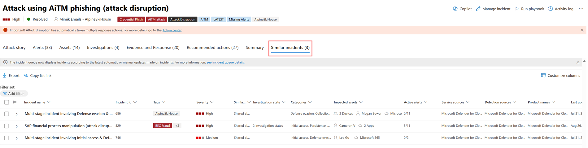 Některé incidenty můžou mít podobné incidenty uvedené na stránce Podobné incidenty . Tato část ukazuje incidenty, které mají podobné výstrahy, entity a další vlastnosti. To vám může pomoct pochopit rozsah útoku a identifikovat další incidenty, které můžou souviset. Tady je příklad.