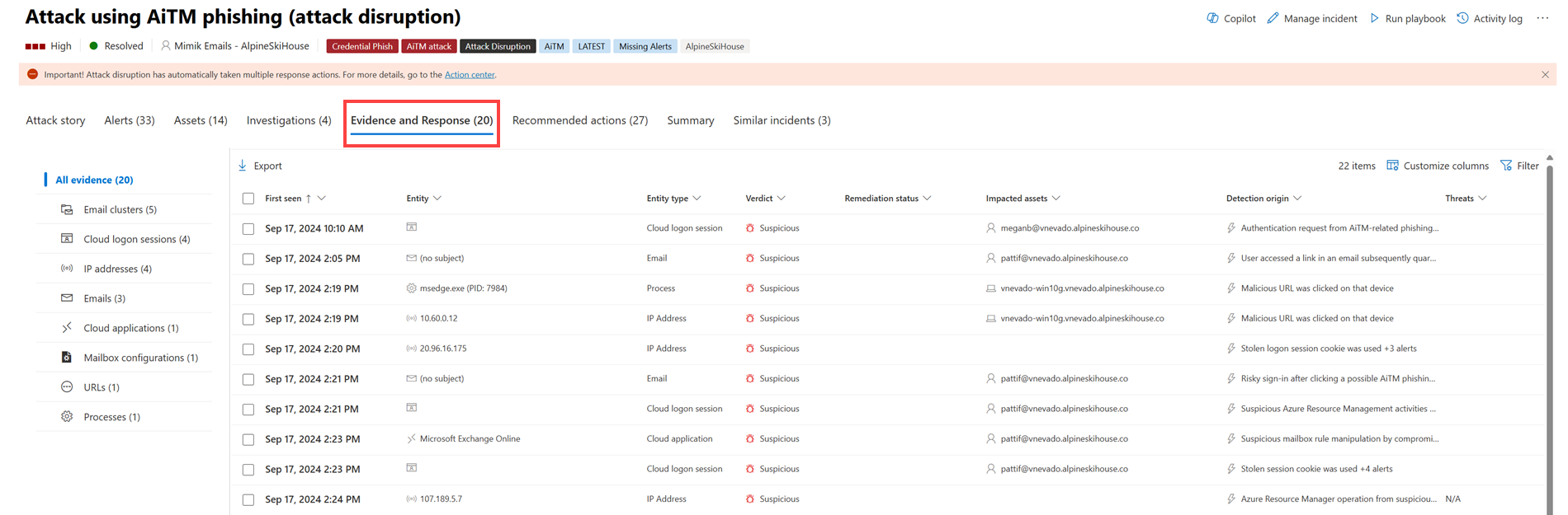 Na kartě Evidence a reakce se zobrazují všechny podporované události a podezřelé entity v výstrahách incidentu. Tady je příklad.