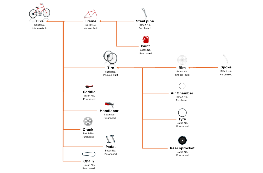 Use the search field to look for a specific serial number of a finished good. For example, use the serial number bike-s0001 or bike-s0002 to find the genealogy tree of a bike from the demo data.