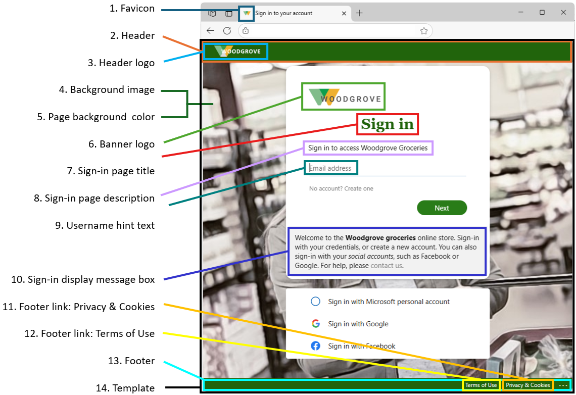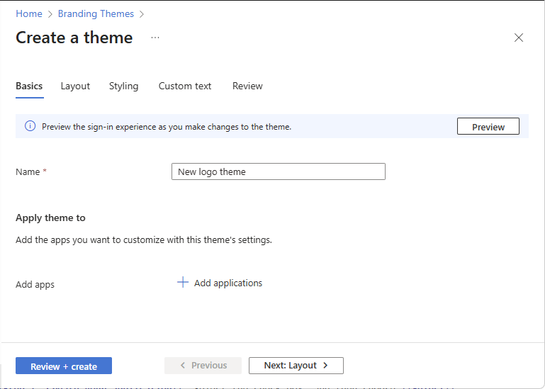 Pro aplikace ve vašem tenantovi můžete vytvořit jedinečná prostředí ověřování. Každá aplikace může mít vlastní motiv, který si můžete přizpůsobit pomocí obrázku nebo barvy pozadí, faviconu, rozložení, záhlaví a zápatí. Toto přizpůsobení přepíše všechny konfigurace provedené u výchozího brandingu. Pokud neuděláte žádné změny prvků, zobrazí se výchozí prvky.
