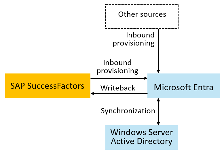 Komplexní pokyny k těmto tématům najdete v plánu nasazení lidských zdrojů v cloudu. Informace o podporovaných entitách, zpracování podrobností a o tom, jak přizpůsobit integraci pro různé scénáře personálního oddělení, najdete v referenčních informacích k integraci SAP SuccessFactors. Další možnosti integrace pro organizace, které mají SAP HCM a nemají SuccessFactors, jsou uvedené v části Zřizování uživatelů ze správy lidských kapitálu SAP (HCM) do Microsoft Entra ID. Můžete mít také další autoritativní zdroje pro jiné identity a některé identity, jako jsou účty break-glass nebo jiní správci IT, které mají Microsoft Entra ID jako jejich autoritativní zdroj.