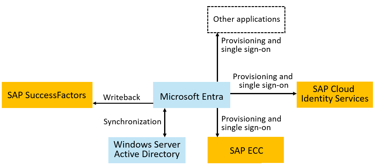 Vaše organizace spoléhá na Microsoft pro různé služby Azure nebo Microsoft 365. Software a služby SAP můžou také poskytovat důležité funkce, jako jsou lidské zdroje (HR) a plánování podnikových zdrojů (ERP) pro vaši organizaci. Microsoft Entra můžete použít k orchestraci identit pro vaše zaměstnance, dodavatele a další a jejich přístup napříč vašimi aplikacemi SAP a bez SAP.