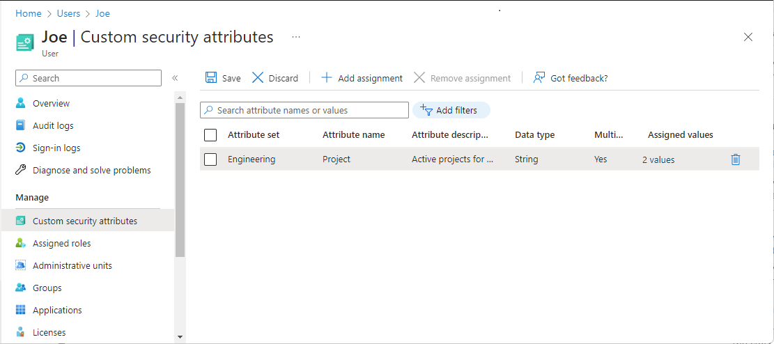 Ujistěte se, že jste definovali vlastní atributy zabezpečení. Další informace naleznete v tématu Přidání nebo deaktivace vlastních definic atributů zabezpečení v Microsoft Entra ID.