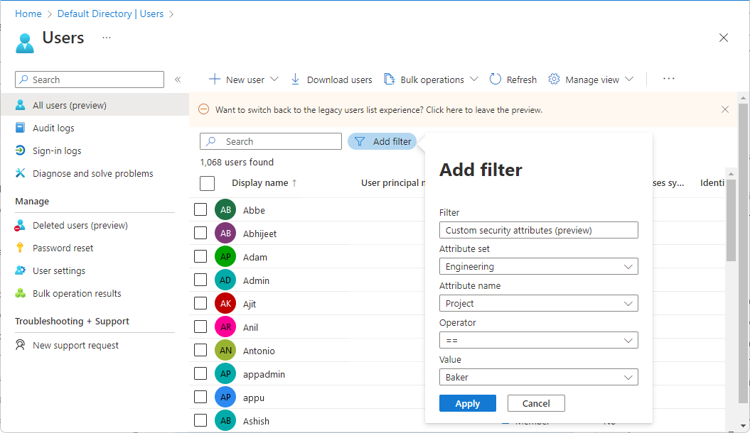 Seznam vlastních atributů zabezpečení přiřazených uživatelům můžete filtrovat na stránce Všichni uživatelé.